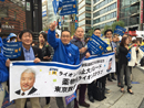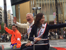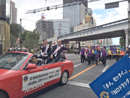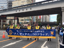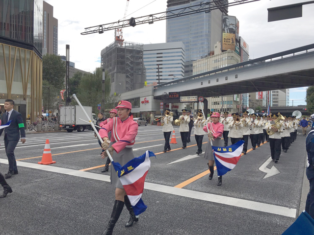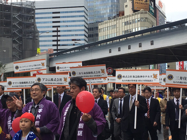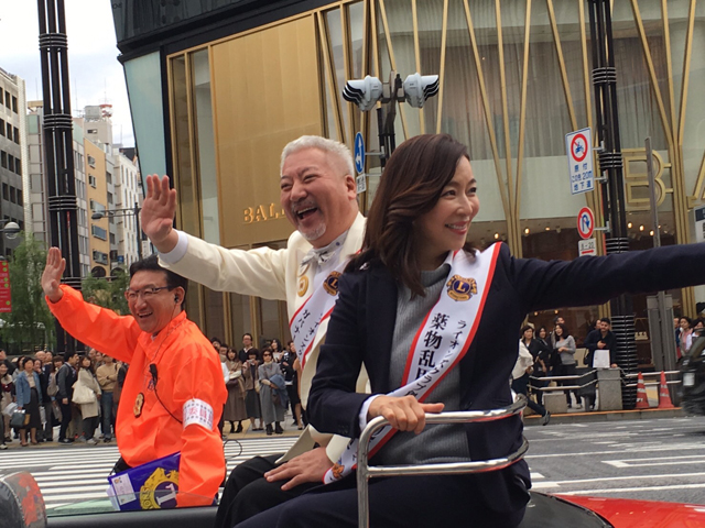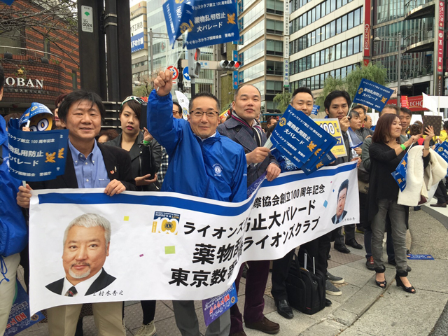 12:30より有楽町のパレードスタート地点において出発式を挙行、沿道の観客に向けて主催者を代表し村木ガバナーより挨拶、そして薬物乱用防止のキャッチフレーズの唱和を全員で行い、13:00よりパレードをスタート、数寄屋箸交差点、丸の内仲通りを経て、東京駅正面の行幸通りまで約1.7km弱のコースを8つのグループに分かれて整然と行進、沿道の観客約7万人に薬物乱用防止をアピールしました。パレードの先頭には警視庁音楽隊、オープンカーに乗った菊川、河北1日署長、真矢PR大使、それから明治小学校マーチングバンド、丸の内警察署協力企業・団体、東京青年会議所、全日本35地区ライオンズクラブ代表が乗った2階建てオープンバス、最後に表参道ライオンズクラブのよさこいチームが行進・パフォーマンスを行いました。